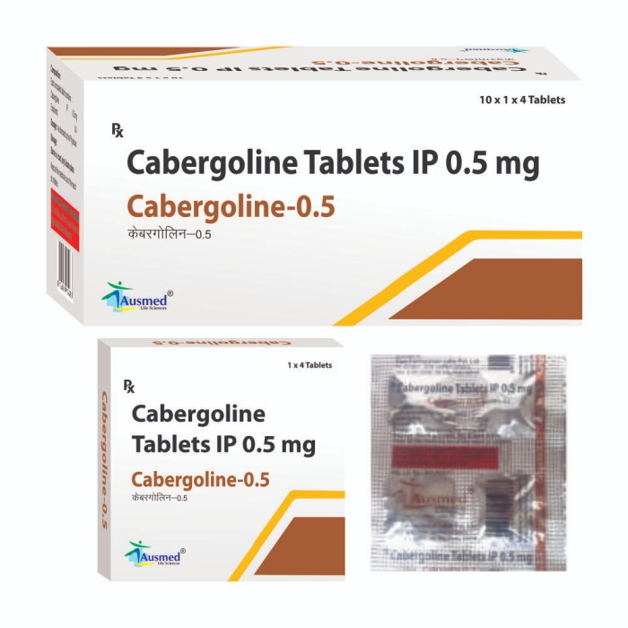 Cabergoline is a powerful dopamine agonist used to manage conditions caused by excess prolactin (hyperprolactinemia). Each Cabergoline 0.5mg tablet contains 0.5 milligrams of Cabergoline, which works by stimulating dopamine D2 receptors in the brain, thereby inhibiting prolactin secretion from the pituitary gland.